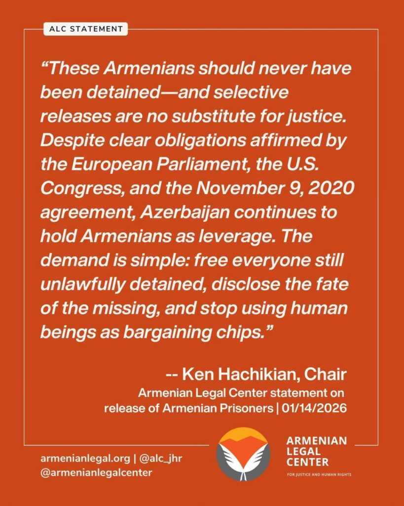 “These Armenians should never have been detained—and selective releases are no substitute for justice,” said Ken Hachikian, Chairperson of the Armenian Legal Center. “Despite clear obligations affirmed by the European Parliament, the U.S. Congress, and the November 9, 2020 agreement, Azerbaijan continues to hold Armenians as leverage. The demand is simple: free everyone still unlawfully detained, disclose the fate of the missing, and stop using human beings as bargaining chips.”
