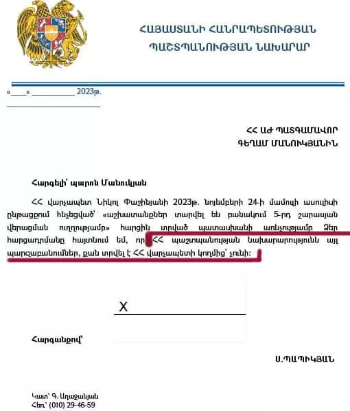 Պաշտպանության նախարար Սուրեն Պապիկյանը ԱԺ ամբիոնից հրապարակային խոստացավ դեկտեմբերի 24-ին ինձ անակնկալ մատուցել։ Չգիտեմ ինչ էր պատրաստվում անել հենց այդ օրը, սակայն դեկտեմբերի 22-ին ՊՆ-ից ստացած հարցմանս պատասխանը պակաս զարմացական չէ: