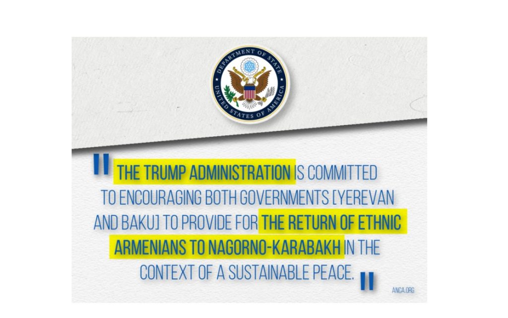 ՎԱՇԻՆԳՏՈՆ, Դի. Սի. – Կոնգրեսի Հայկական Խմբակցութեան ամիսների շարունակական ճնշմանը եւ անդադար ամերիկահայութեան պաշտպանութեանը ի պատասխան՝ Թրամփ-Վենսի վարչակազմը անցեալ շաբաթ՝ աննախադէպ քայլով, յայտարարեց, որ Միացեալ Նահանգները ակտիւօրէն խրախուսում է ինչպէս Երեւանին, այնպէս էլ Բաքուին ապահովել «էթնիկ հայերի վերադարձը Լեռնային Ղարաբաղ», հաղորդում է Ամերիկայի Հայ Դատի յանձնախումբը (ANCA):