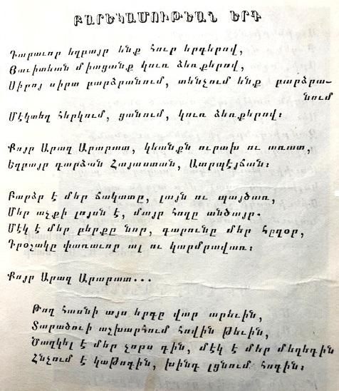 Երգը քաղած եմ նախակրթարանի աշակերտութեան օրերու երգարանէս: Անիկա կը ձանասփռուէր, կը հնչէր «հայրենասէրներու» տուներուն մէջ…: Իսկ թէ նման «բանաստեղծութիւն» գեղարուեստական ի՞նչ արժէք ունի, արդեօք խնդուք պատճառող բառակոյտէ աւելի բա՞ն մըն է՝ արդէն ուրիշ հարց է: