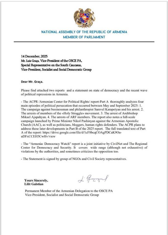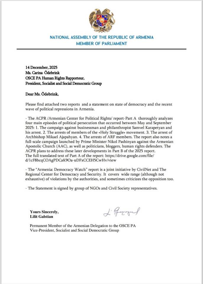 Լիլիթ Գալստյանը ԵԱՀԿ ԽՎ պաշտոնյաներին նամակներ է ուղարկել՝ ներկայացնելով ՀՀ-ում ժողովրդավարության և բռնաճնշումների պատկերը