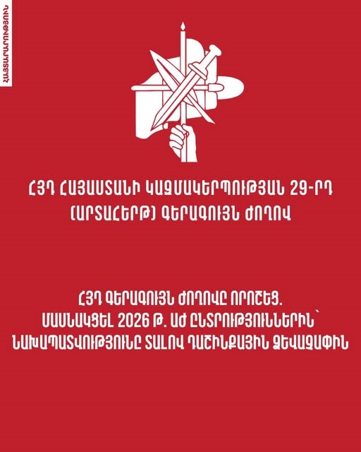 ՀՅԴ Հայաստանի կազմակերպության 29-րդ (արտահերթ) Գերագույն ժողովը, քննելով ՀՀ Ազգային ժողովի 2026 թ. ընտրություններին ՀՅԴ-ի մասնակցության ձեւաչափի հարցը, հիմք ընդունելով մարզային և քաղաքային ժողովների առաջարկությունները, ինչպես նաեւ ժողովի մասնակիցների տեսակետներն ու կարծիքները, արձանագրեց.