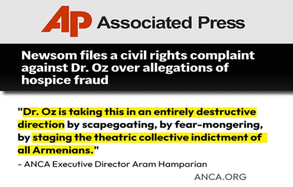 03 Փետրվար 2026 ԴԱՏԱՊԱՐՏՈՒՄԻ ԱԼԻՔԸ Կ՛ԱՃԻԻնչպէս անցեալ շաբաթ հաղորդեցինք, Արեւմտեան Ամերիկայի Հայ Դատի յանձնախումբը խստօրէն դատապարտեց «Մետիքեր»ի եւ «Մետիքէյտ»ի սպասարկութիւններու կեդրոններու (CMS) վարիչ տոքթ. Մեհմետ Օզի կողմէ կատարուած յայտարարութիւնները, որոնց մէջ Լոս Անճելըսի առողջապահական սպասարկութիւններու ոլորտէն ներս ենթադրեալ զեղծարարութիւնները կը կապուին «օտար ազդեցութիւններ»ու հետ, ներառեալ՝ «ռուսահայ հրոսակախումբեր»ու, ինչպէս նաեւ հայ ինքնութիւնը, հայերէնը եւ համայնքային ներկայութիւնը կը ներկայացուին իբրեւ յանցագործութեան ցուցանիշ: