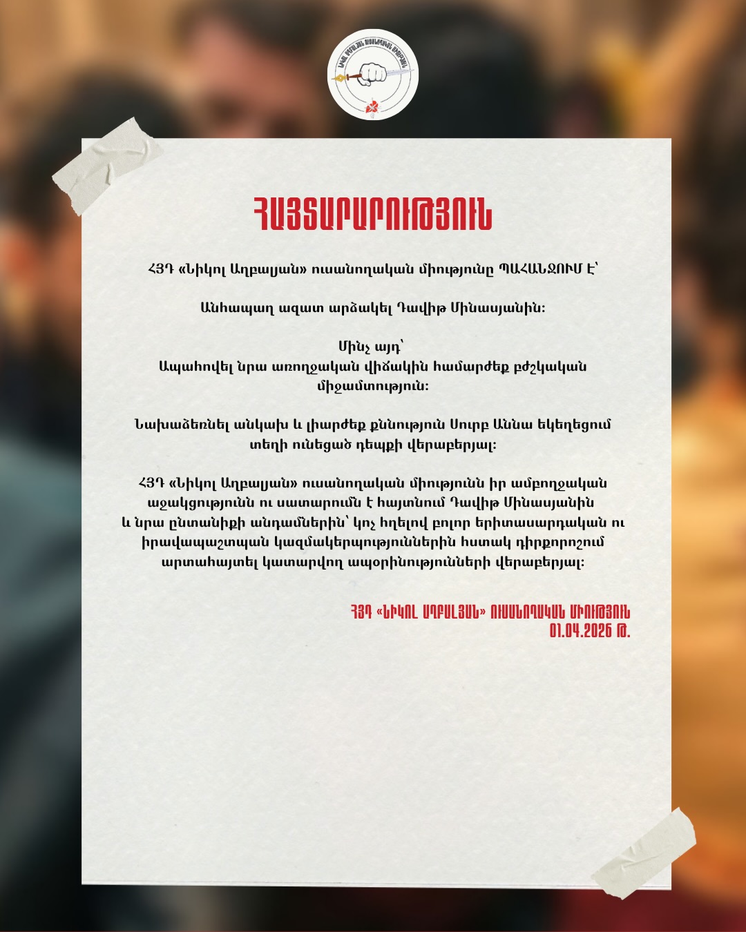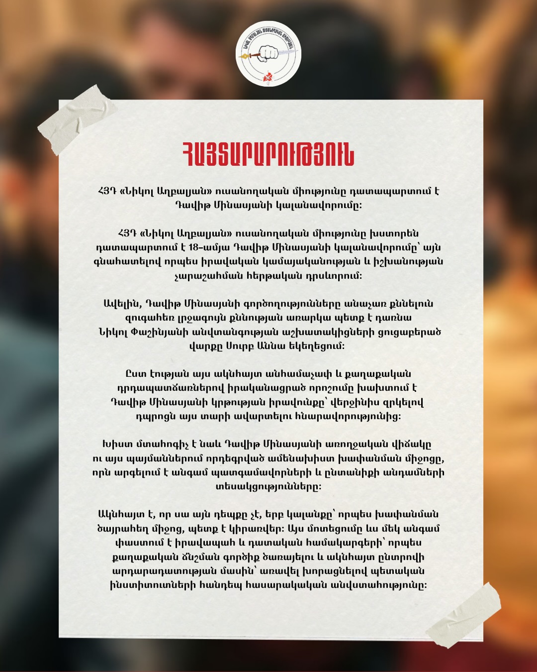 ՀՅԴ «Նիկոլ Աղբալյան» ուսանողական միությունը խստորեն դատապարտում է 18-ամյա Դավիթ Մինասյանի կալանավորումը՝ այն գնահատելով որպես իրավական կամայականության և իշխանության չարաշահման հերթական դրսևորում։